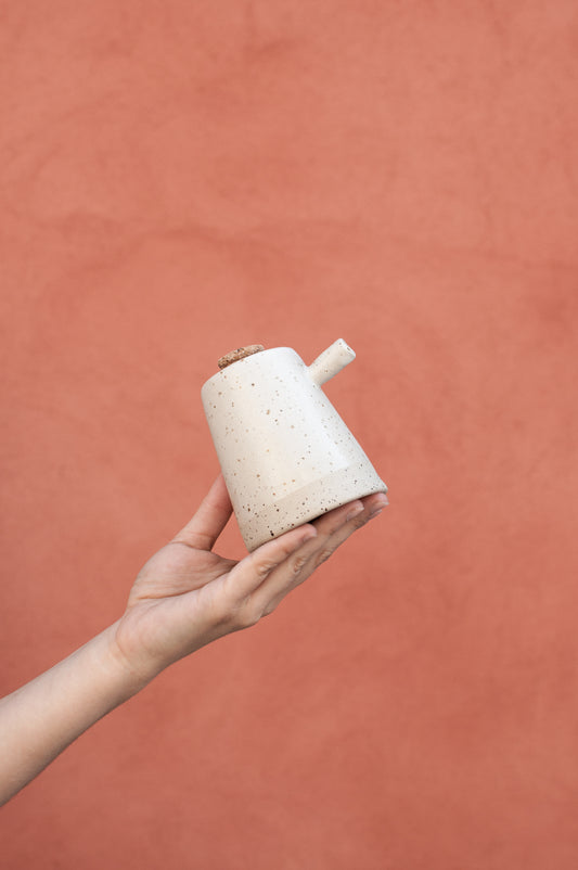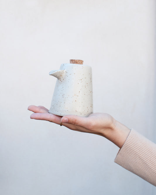 Oliera in ceramica con tappo in sughero, piccola oliera bianca con puntini, fatta a mano